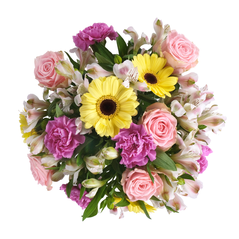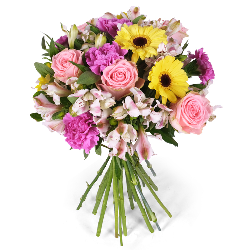 Prezent z sercem - róże i goździki w duecie miłości, połączone z alstromerią i gerberą. Świeże liście dopełniają całość, tworząc naturalne tło i ramę dla kolorowych kwiatów, podkreślając organiczny charakter bukietu. Idealne rozwiązanie na okazje wymagające delikatności, klasy i wyrafinowania.