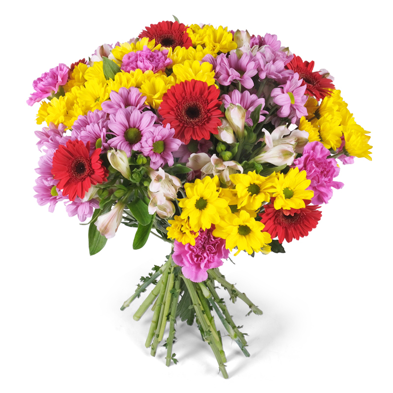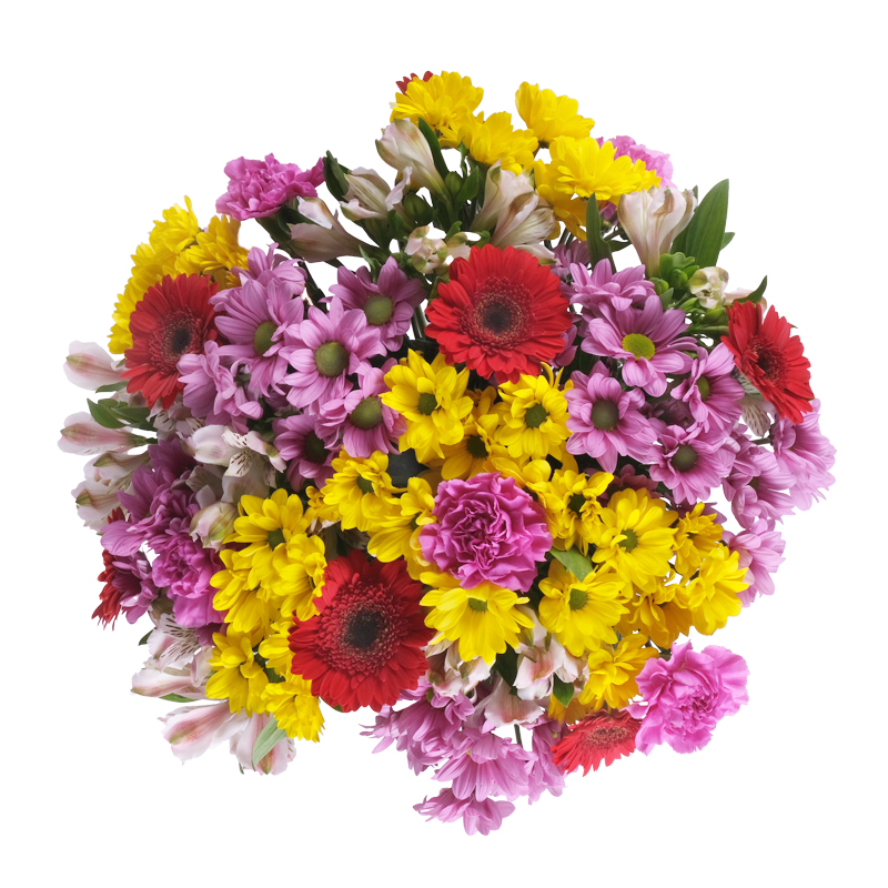 Kwiaty, które mówią „dziś jest dobry dzień". Bogactwo gatunków to nie tylko piękny widok, ale też gwarancja uśmiechu! Gerbery, santini, goździki i alstromerie tworzą radosną kompozycję, która natychmiast poprawia humor.