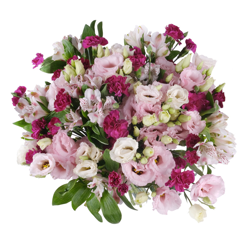 Bukiet Miłosny List jest jak romantyczna wiadomość: jasna eustoma i alstromeria niosą czułość, a ciemniejszy goździk dodaje odwagi.