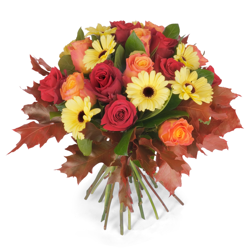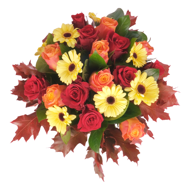 Bukiet to doskonałe połączenie tradycji i nowoczesności. Róże i gerbery w otoczeniu liści klonu prezentują się niezwykle efektownie. „Obfita Jesień” to kompozycja, która wnosi przytulny klimat. Idealna na prezent lub dekorację. Subtelna i pełna uroku – dla każdego!